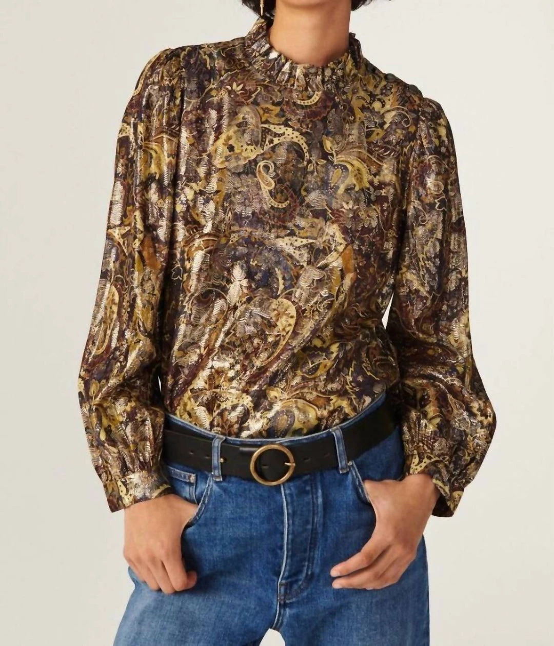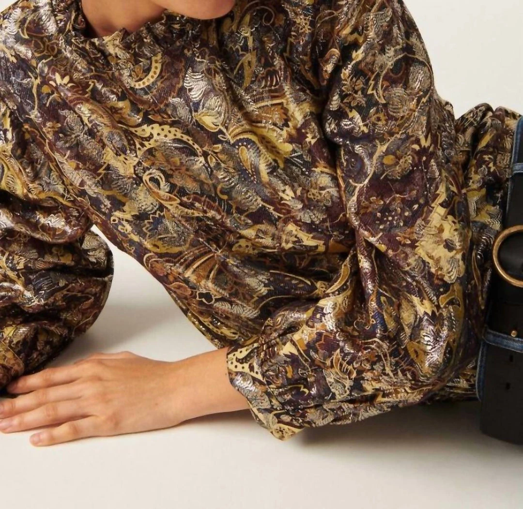 Designed with a frilly stand-up collar and long sleeves, the Calo top is incredibly chic. It is crafted from jacquard fabric with golden Lurex threads to make you sparkle at events this season! Calo also features a baroque print for a super glamorous look. Our favorite detail? Its adorable shoulder gems! This item contains viscose derived from sustainably managed forests.- Printed top- Long sleeves- Jacquard fabric- Golden Lurex threads- Shoulder gems