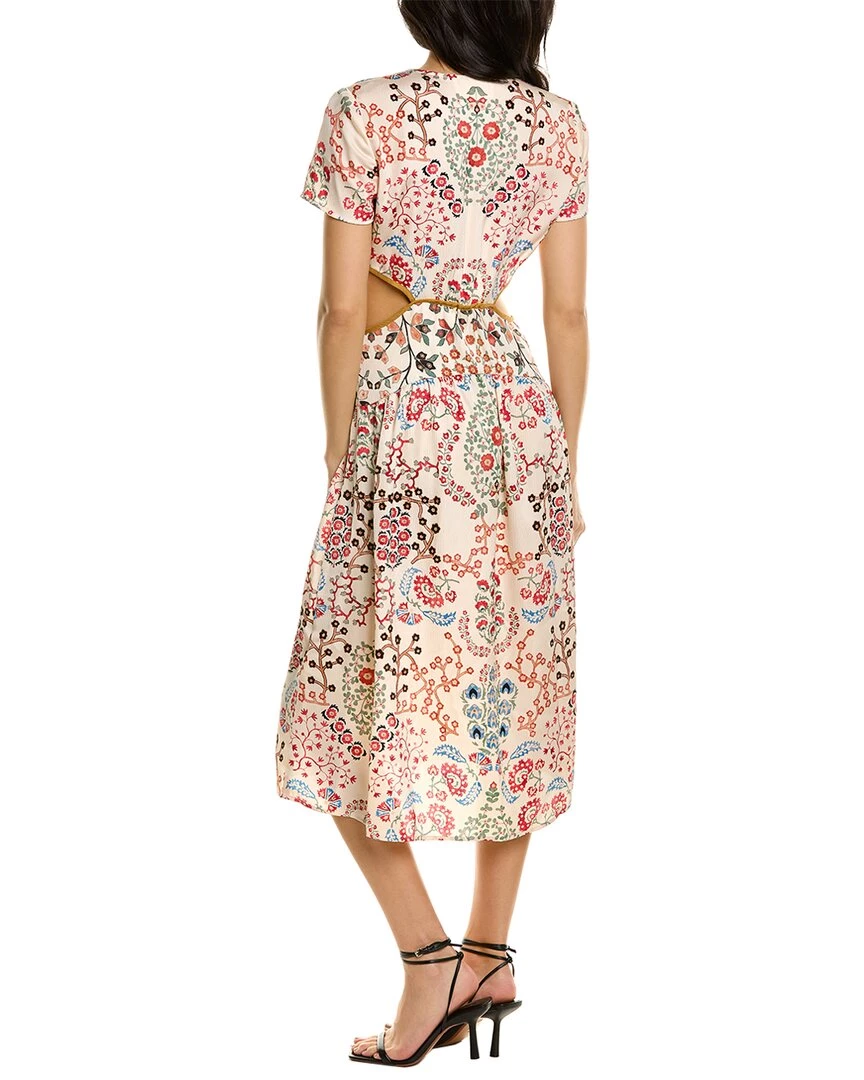 - Cut-Out Midi Dress In Cream Multicolor Floral With Cap Sleeves, V-Neck, And Butouts At Waist