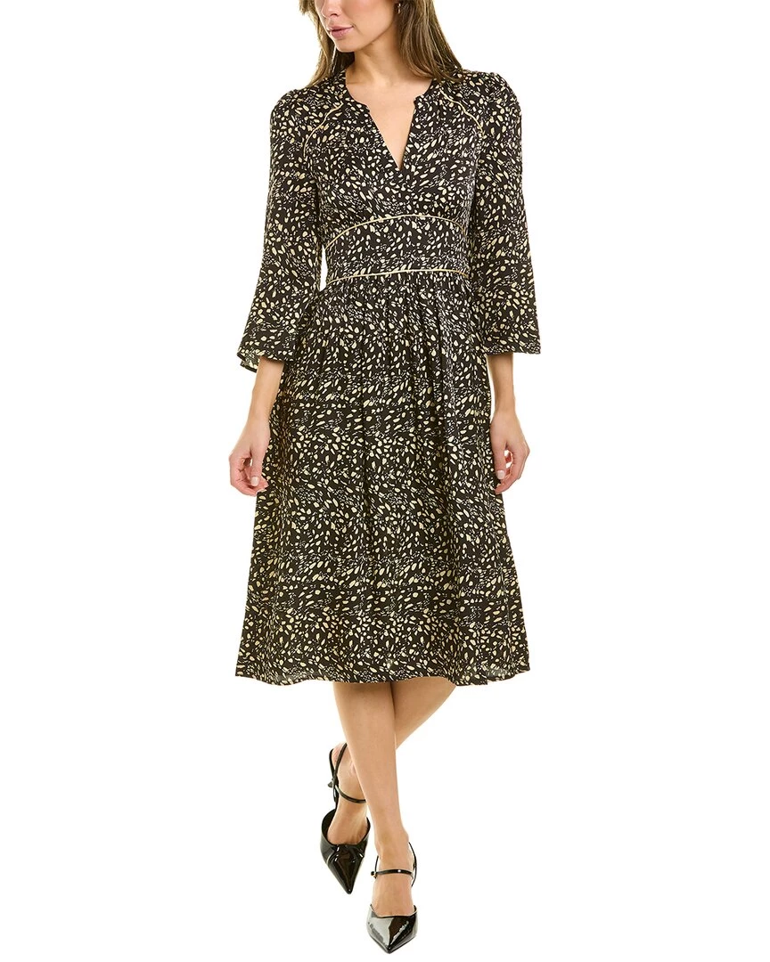 - Esme Midi Dress In Noir With V-Neck, 3/4-Length Sleeves, And Shirred Waist