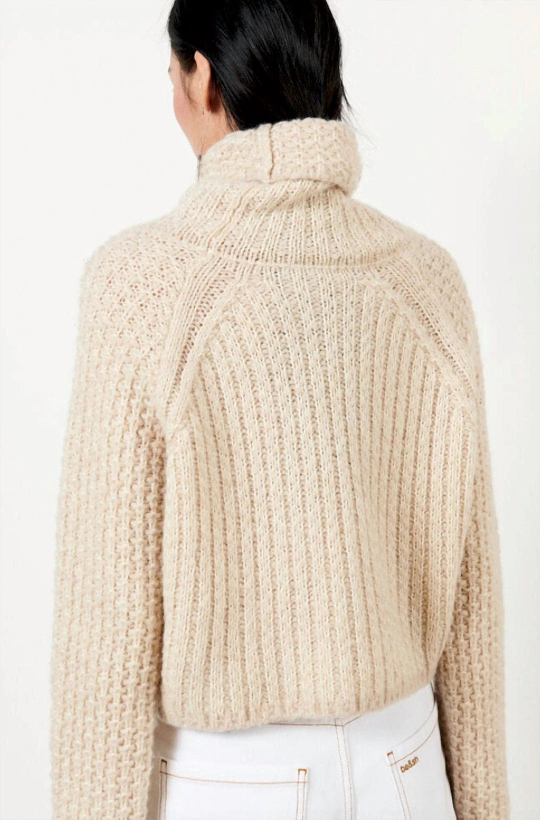 It has a short and boxy shape with a high neck and long raglan sleeves. Wear them turned back to show off the inside pattern. This sweater is made in a soft two-ply yarn (one thick, one slighter) that creates a textured pattern. Both sides are different and are contrasted inside and outside on the body and sleeves. A short sweater with a graphic effect that’s best worn with high-waist pants.- Short sweater- High neckline- Long sleeves- 58% alpaca, 21% wool, 21% polyamide