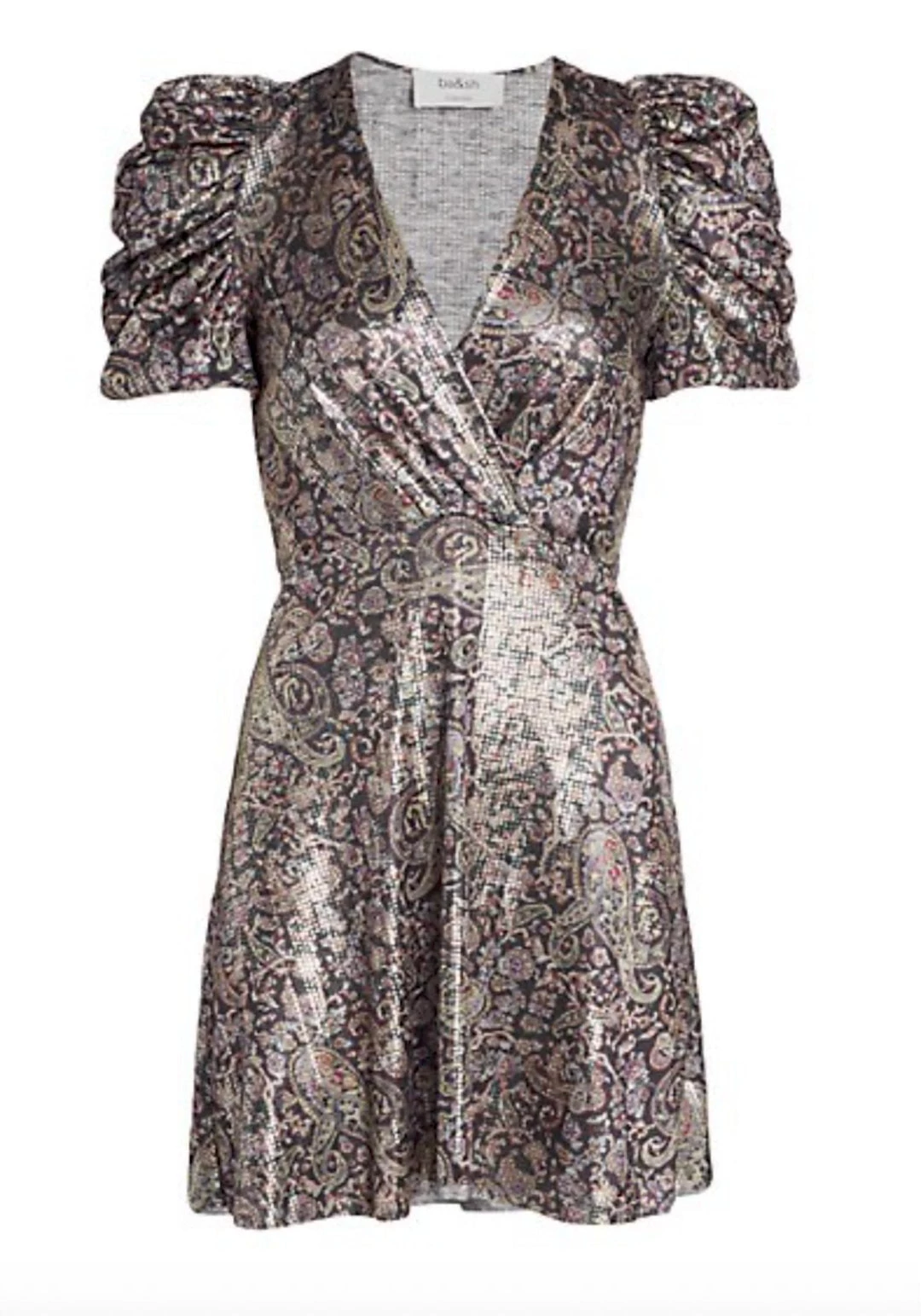 This metallic printed mini-dress features a gathered puffed short sleeves and a surplice neckline.Surplice neckShort sleevesPullover style95%polyester/5% elastane