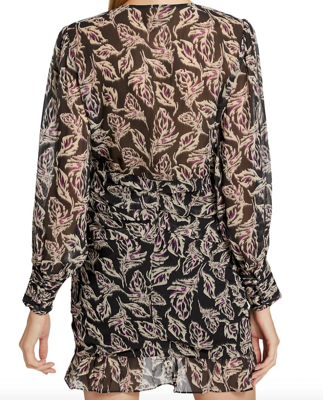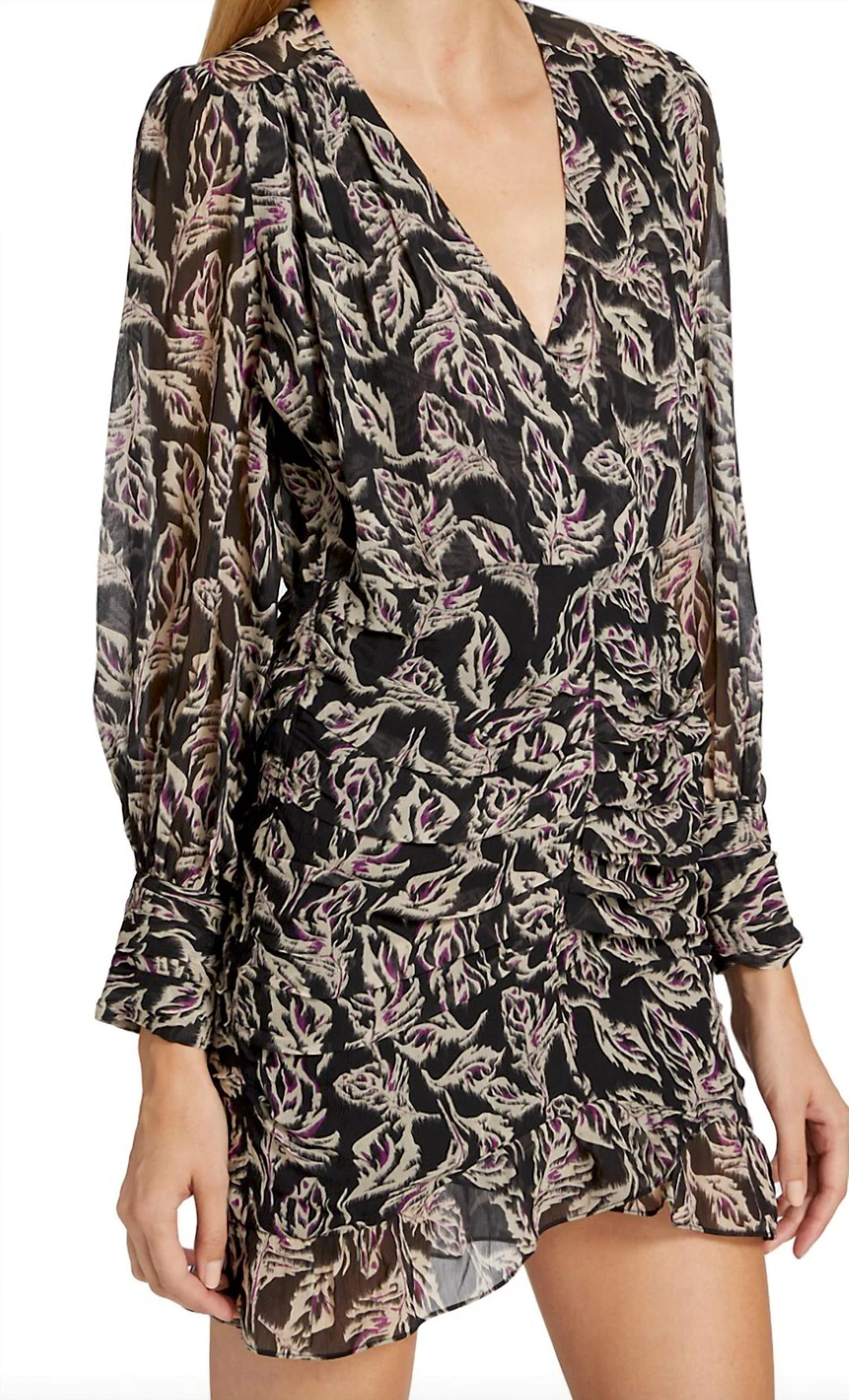 The short bodycon dress has a sexy V-neckline and long sleeves with button cuffs. It’s made in a light and breezy fabric enhanced with a abstract floral-like print. Wear this dress with a beautiful belt and ankle boots.This style is made in a viscose which comes from sustainably managed forests.- Short dress- V-neckline- Long sleeves- Lined- 100% viscose