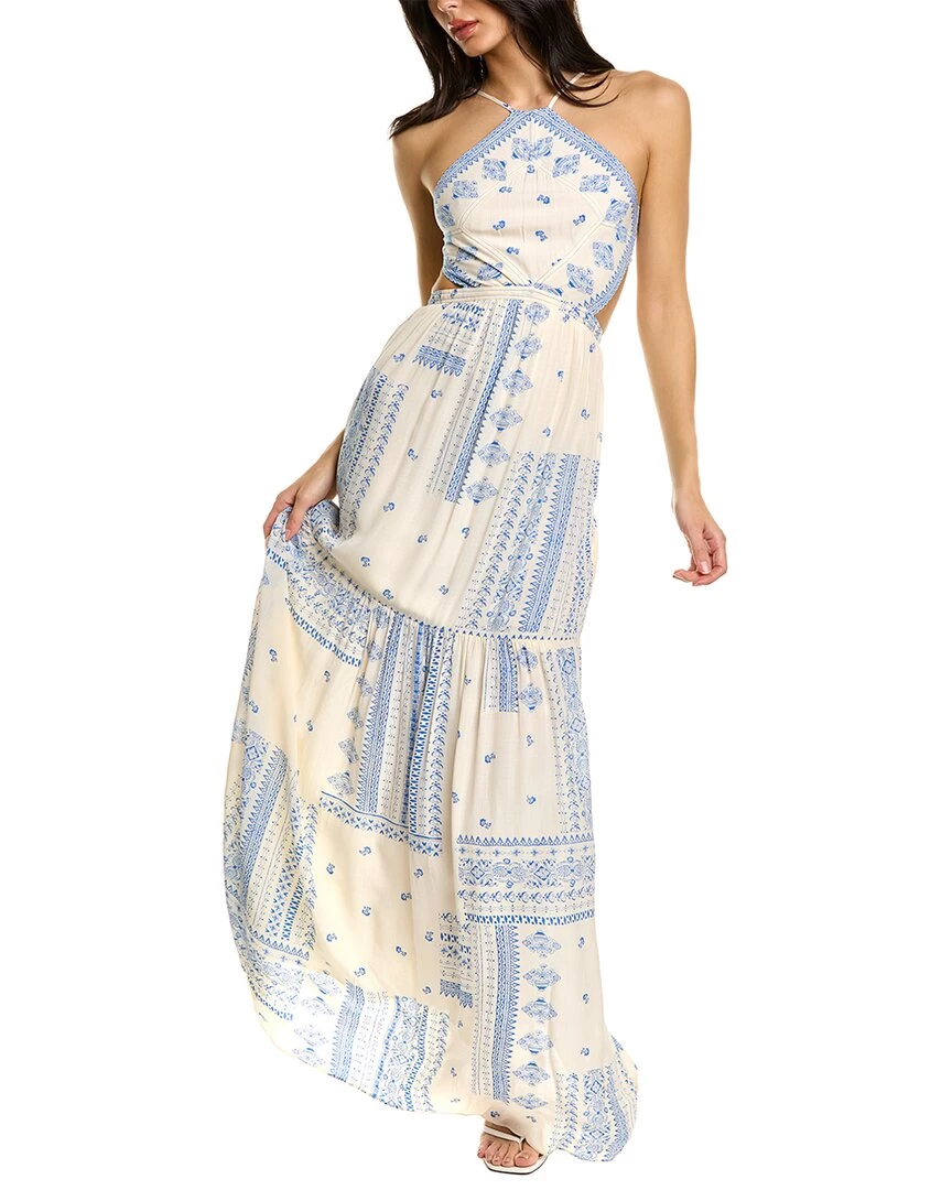 - Halter Maxi Dress In White And Blue Combo With Cut-Outs At Waist, Open Back, Adjustable Spaghetti Straps, And Ribbon Tie At Back