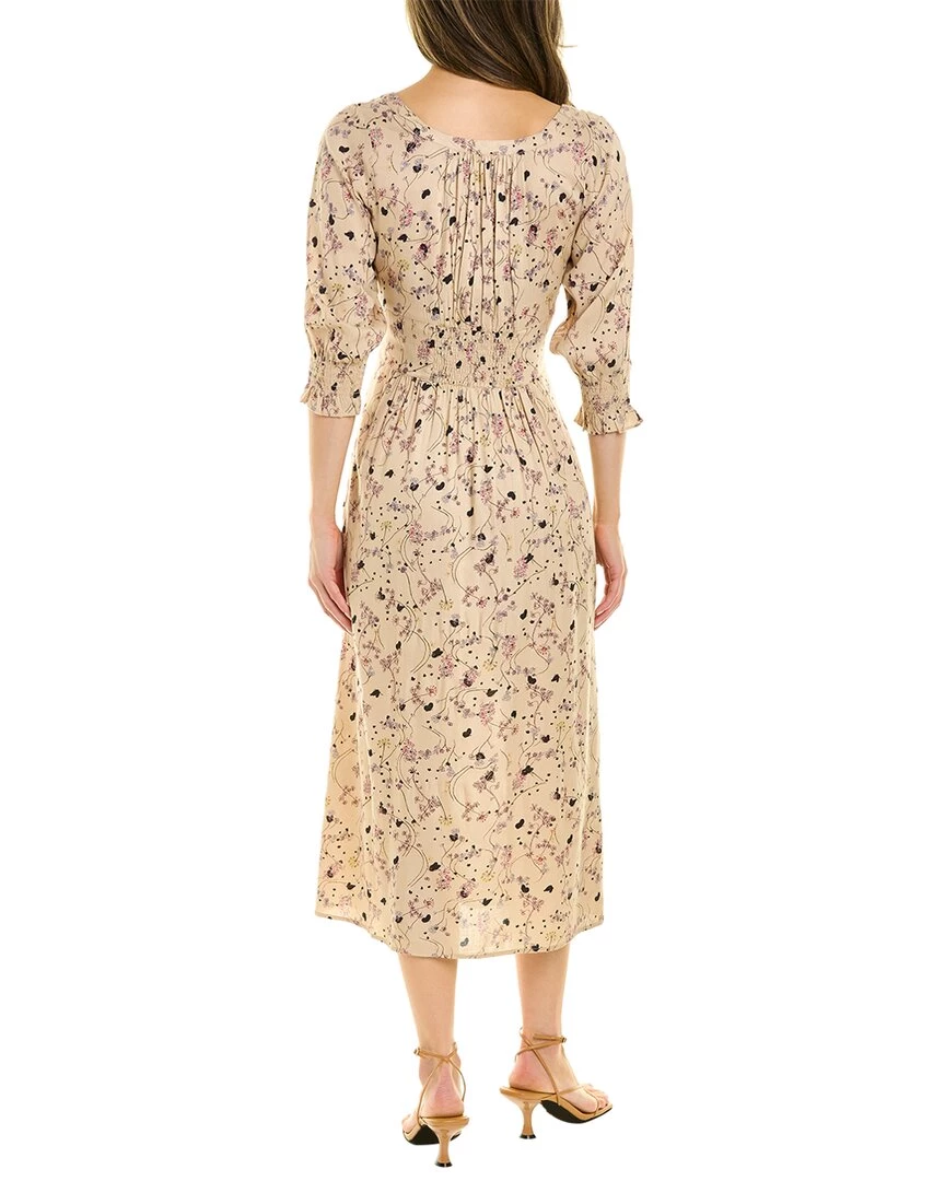 - Maya Midi Dress In Nude With Square Neckline, 3/4-Length Sleeves, Smocked Cuffs, And Shirred Detailing