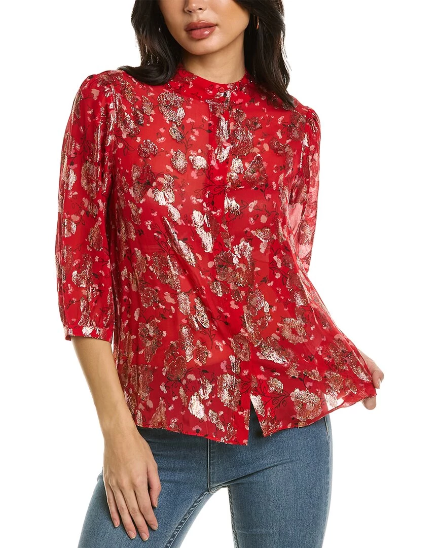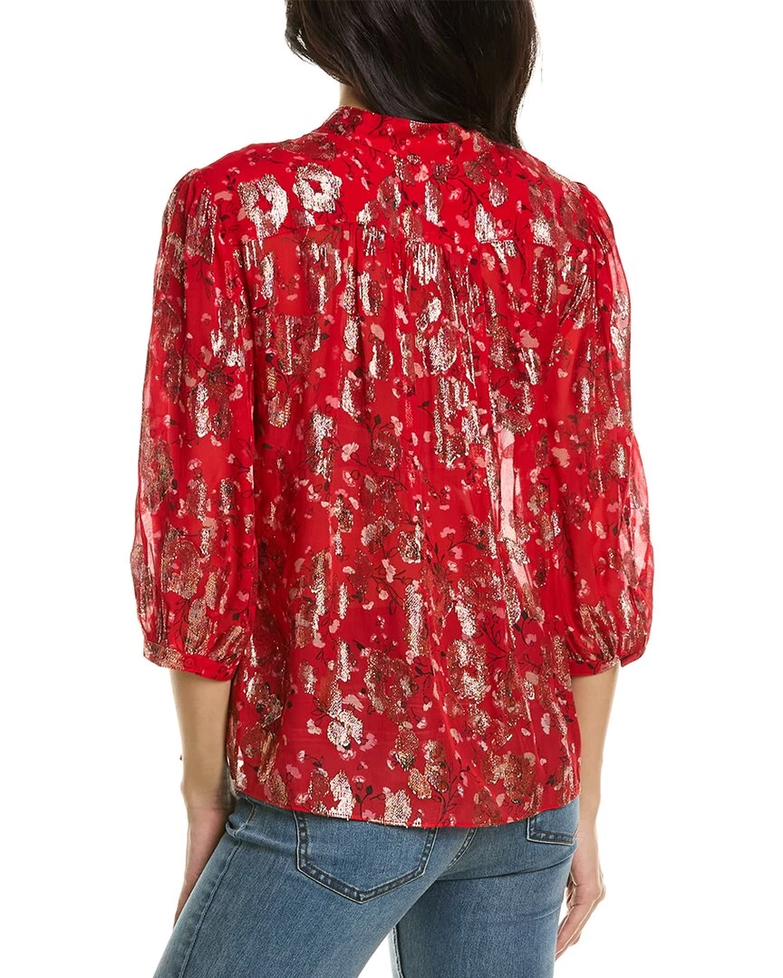 - Metallic Silk-Blend Blouse In Red With Mandarin Collar And Button Cuffs