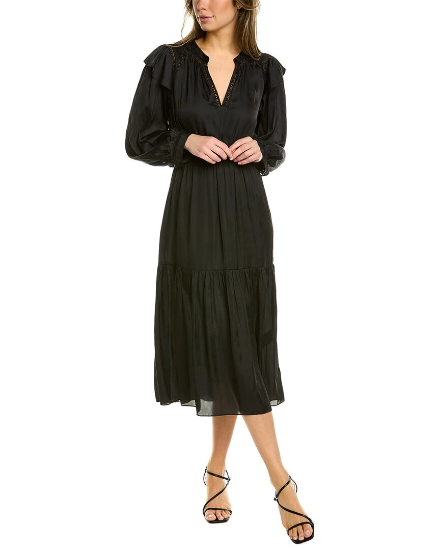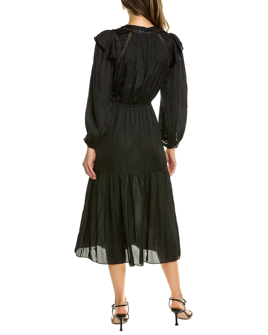 - Midi Dress In Black With Elasticized Waist, Lace Trims, Ruffles At Shoulders, And Split Neck