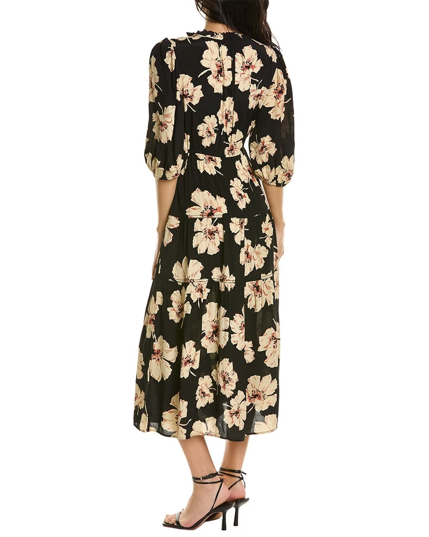 - Midi Shirtdress In Black And White Floral With V-Neck, Ruffle Trim Collar, 3/4-Length Sleeves, And Tiered Skirt