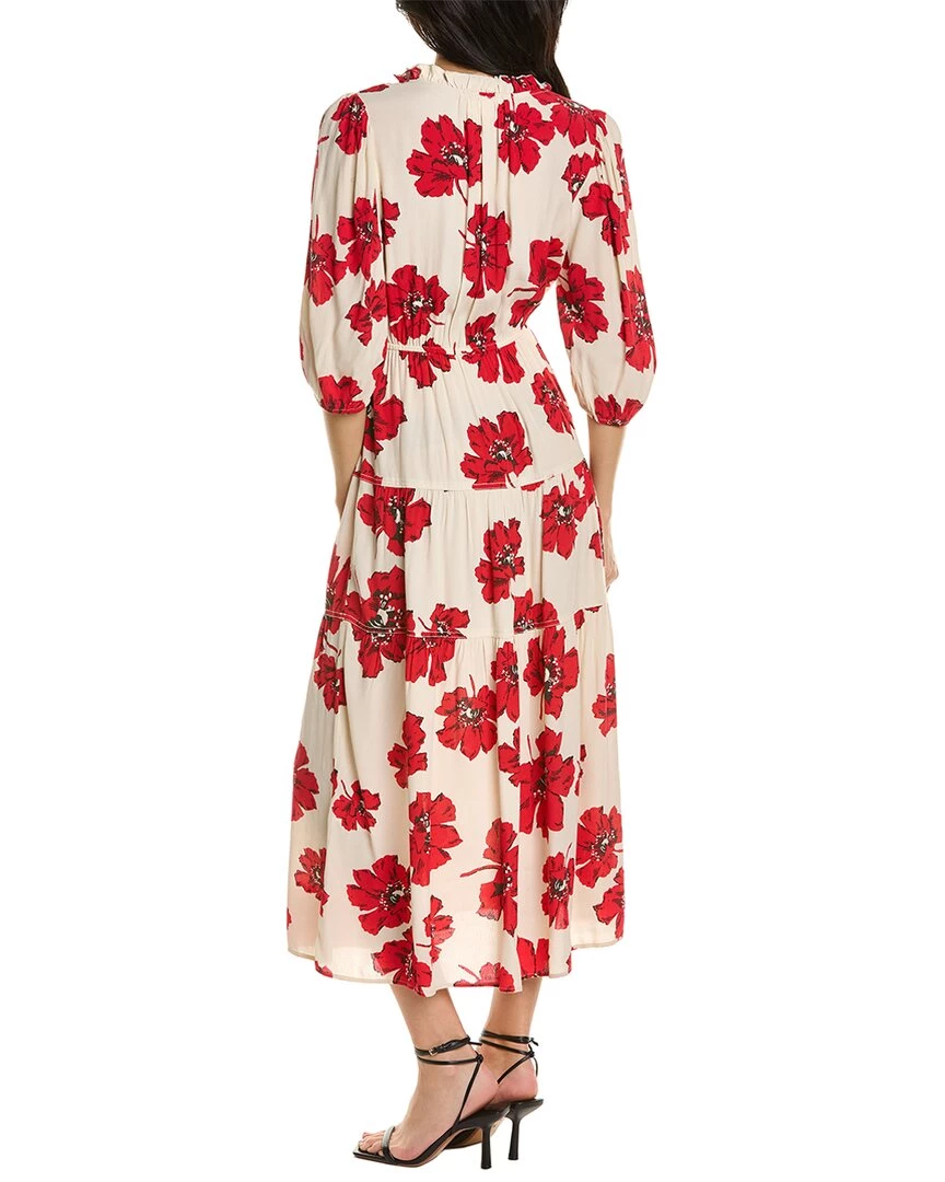 - Midi Shirtdress In Cream And Red Combo With V-Neck, Ruffle Trim Collar, 3/4-Length Sleeves, And Tiered Skirt