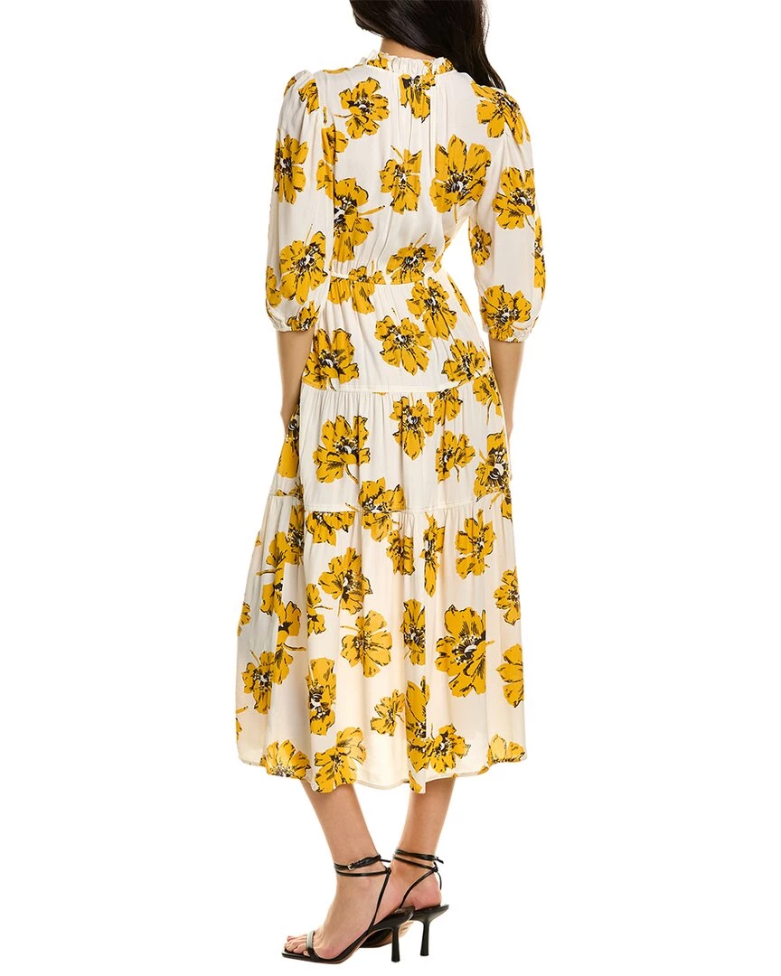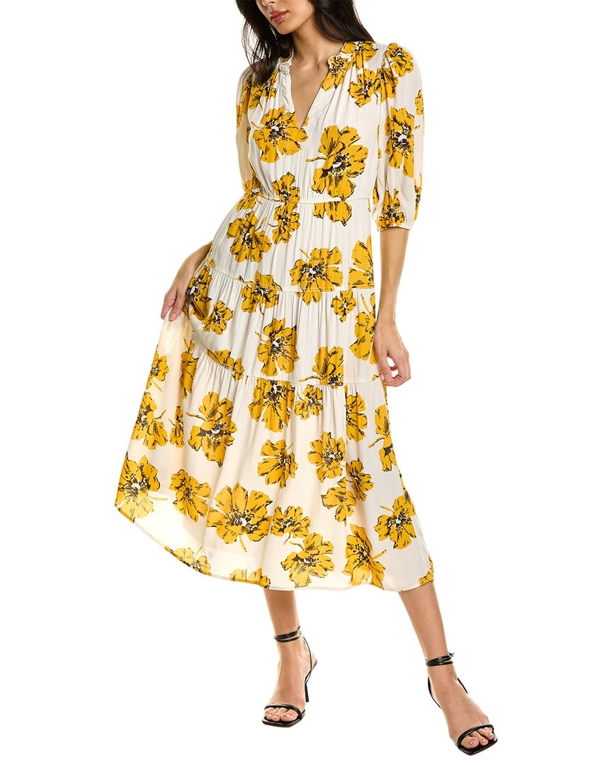 - Midi Shirtdress In Yellow And White Floral With V-Neck, Ruffle Trim Collar, 3/4-Length Sleeves, And Tiered Skirt