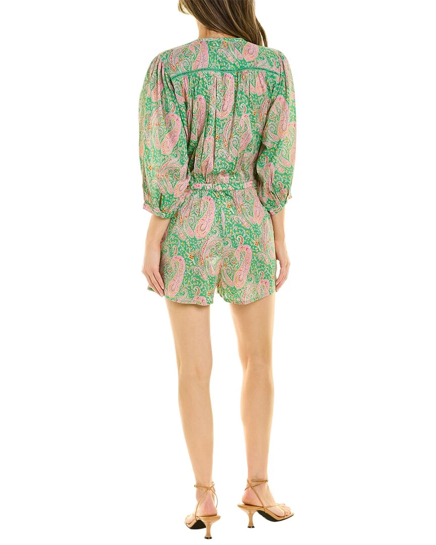 - Oria Romper In Vert With Shirred Shoulders, Ladderstitch Trim, Voluminous 3/4-Length Sleeves, Button Cuffs, And Dual Front Pockets