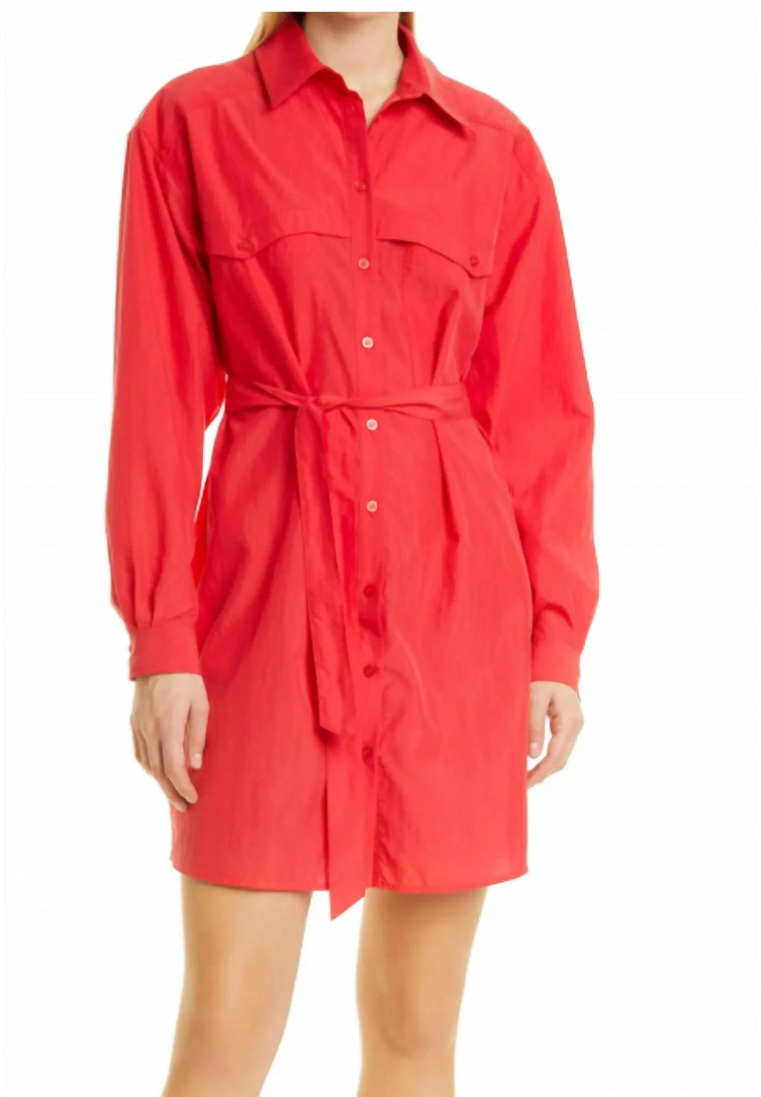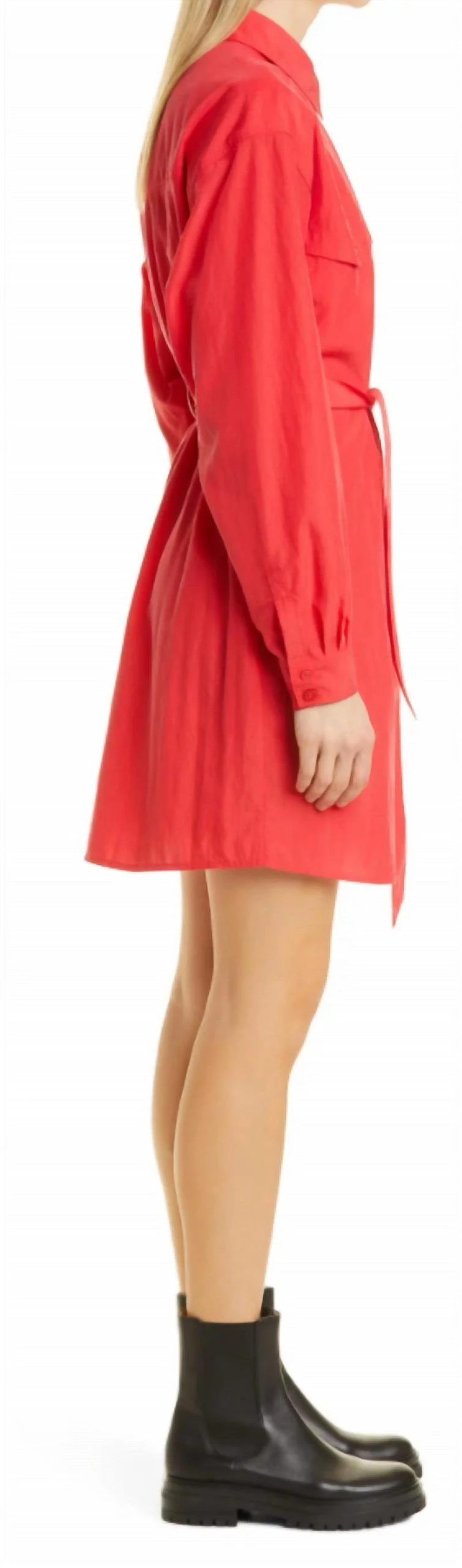 The short dress pairs a shirt collar and classic long sleeves, and it has a fabric tie belt. Made in a lightweight fabric that’s pleasant to wear and enhanced with a discreet shiny note. The fashion plus are the flap patch pockets below a pointy western-inspired yoke. A lightweight and easy shirt-dress to wear belted with a beautiful leather belt.This style contains Tencel Lyocel, a fibre made from wood pulp that comes from sustainably managed forests in a closed circuit. – Shirt-dress- Shirt collar- Long sleeves- Tie belt- 64% Tencel, 36% polyamide