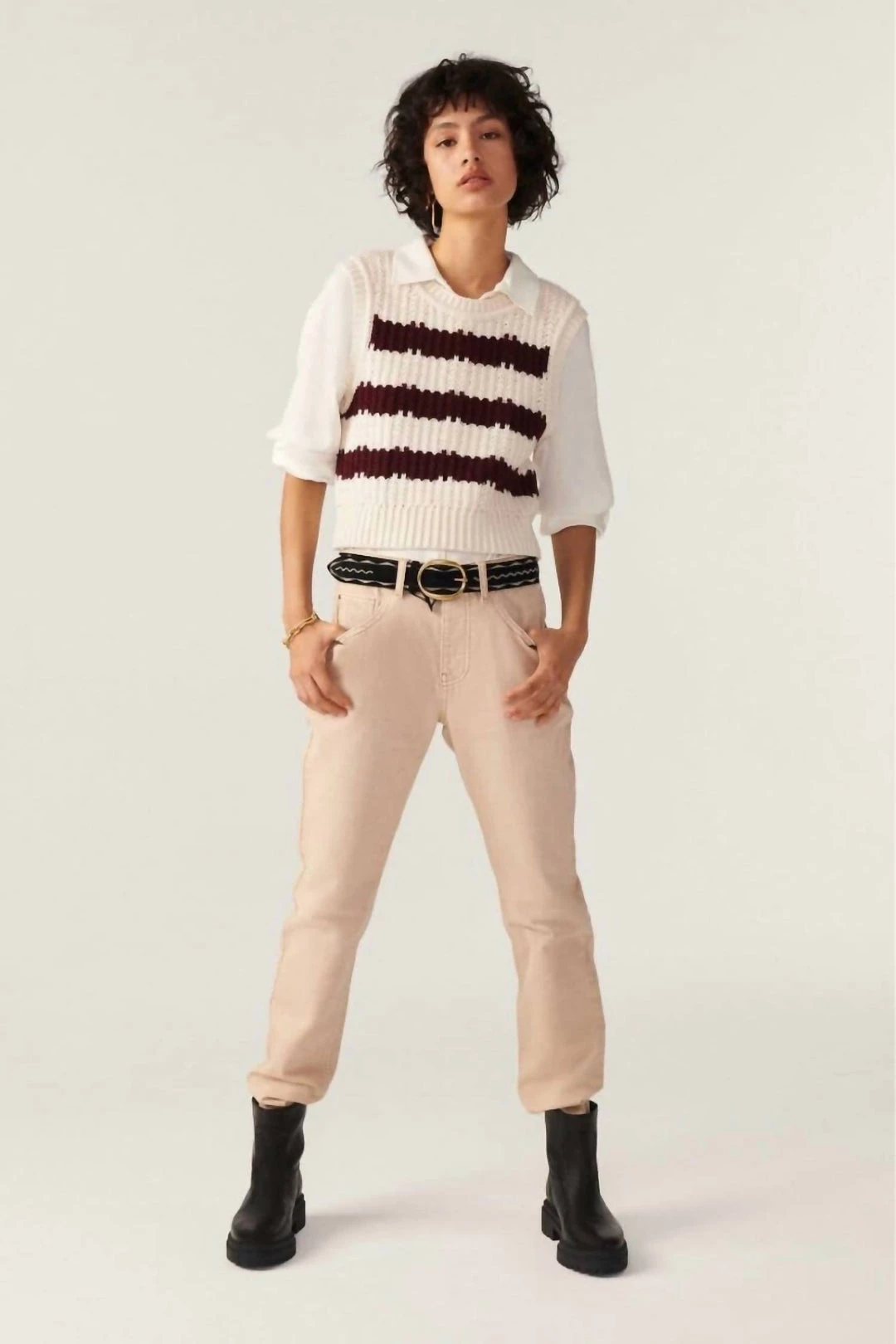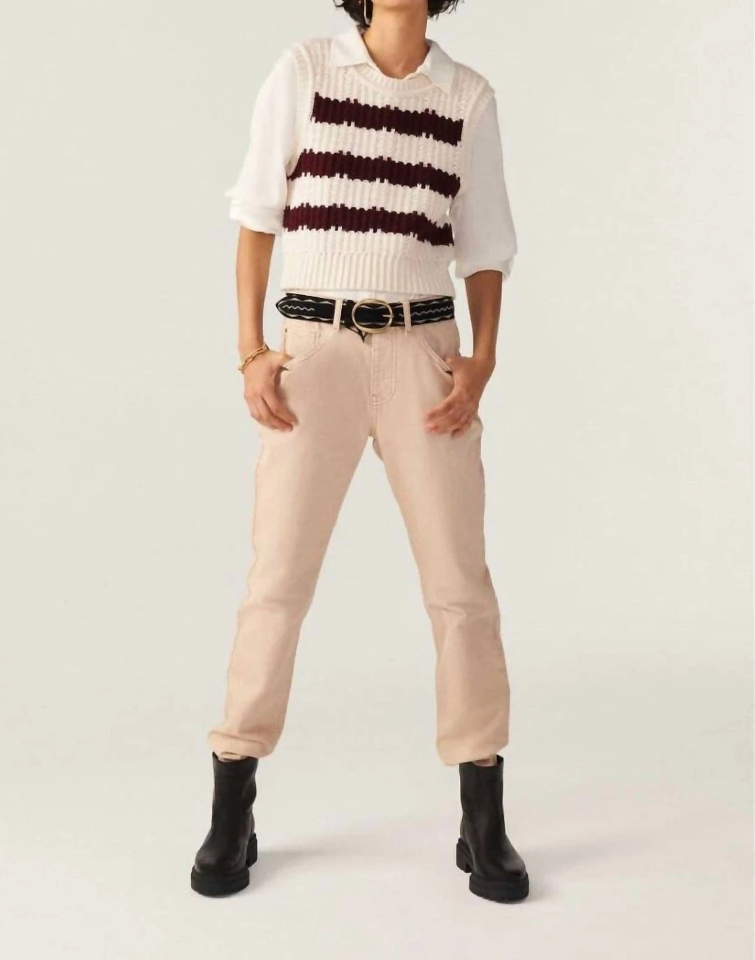 Snug-fitting and sleeveless, this sweater is done in decorative knit with large brown strips. Made long to bring out your waist, it also features ribbed trim on the collar, hem, and armholes. We love the rhinestone buttons on the left shoulder. Feel free to wear this sweater over a shirt or dress.This sweater contains organic cotton and ethically sourced wool. For wool to be “”ethical,”” it must ensure the well-being of the sheep from which it is derived, as well as guarantee that the pastures are managed in a sustainable manner.- Sleeveless sweater- Cotton and wool