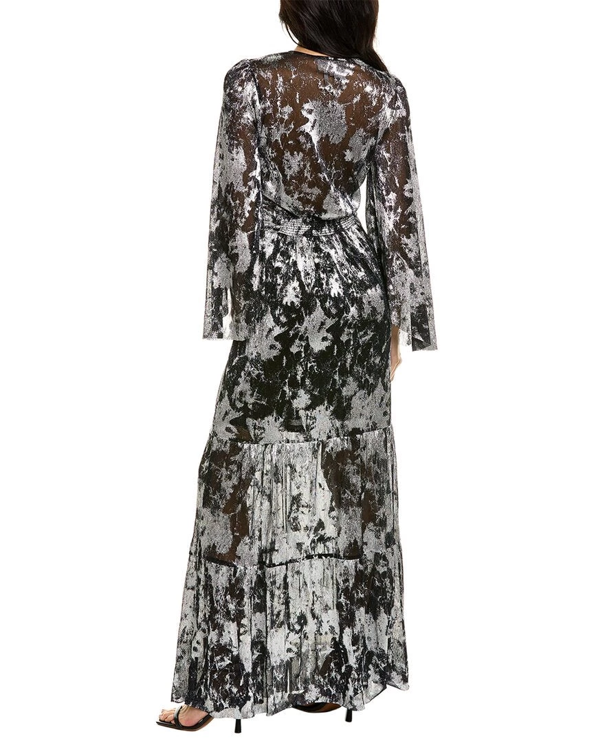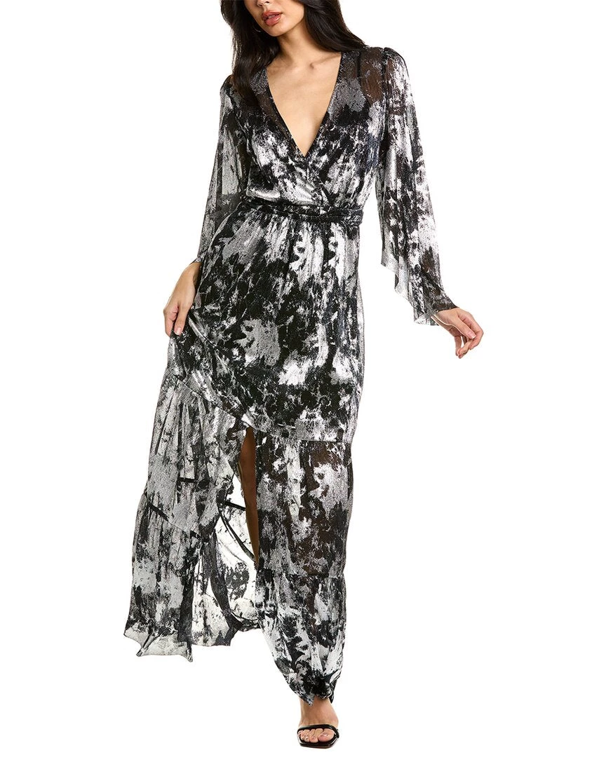 - Surplice Maxi Dress In Black And Silver Combo With Angel Sleeves, Elasticized Waist, Center Slit At Hem