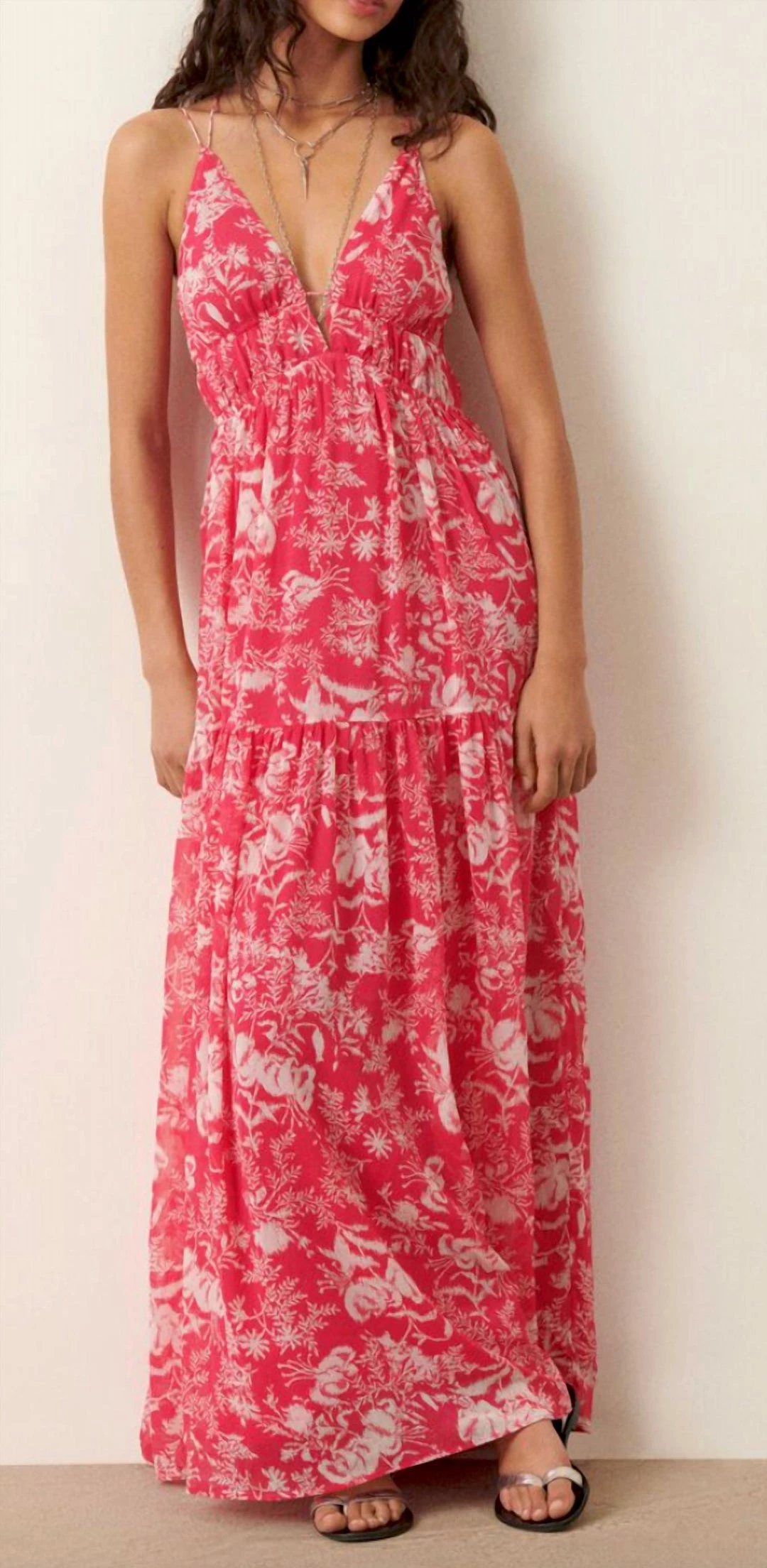 The maxi dress has a seductive and uber-feminine V-neckline. Narrow straps tie at the nape of the neck and crossover in the back for a graphic backless effect. The dress is cut in a breezy and flowing fabric enhanced with a floral motif. It’s lined for comfort. A long and filmy dress made for hot summers.This style contains no toxic substances exceeding requirements of current regulations. It is especially respectful of your skin.- Long print dress- V-neckline- Narrow straps- Backless- Back elastic- Lined- 100% viscose