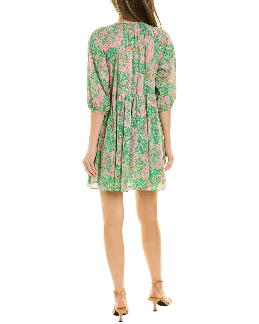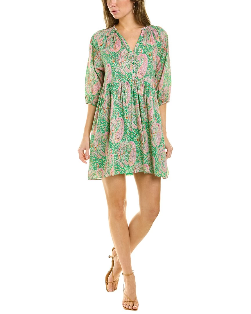 - V-Neck Mini Dress In Vert With Split Neckline, Smocked Trim And Shirred Waist
