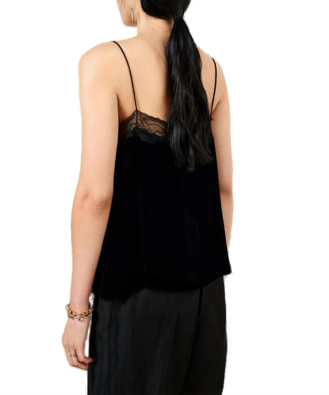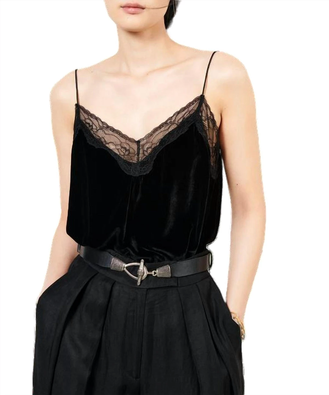 Delicate spaghetti straps and lace contrasts the heavy velvet drape. Camisole topNarrow strapsLace trim